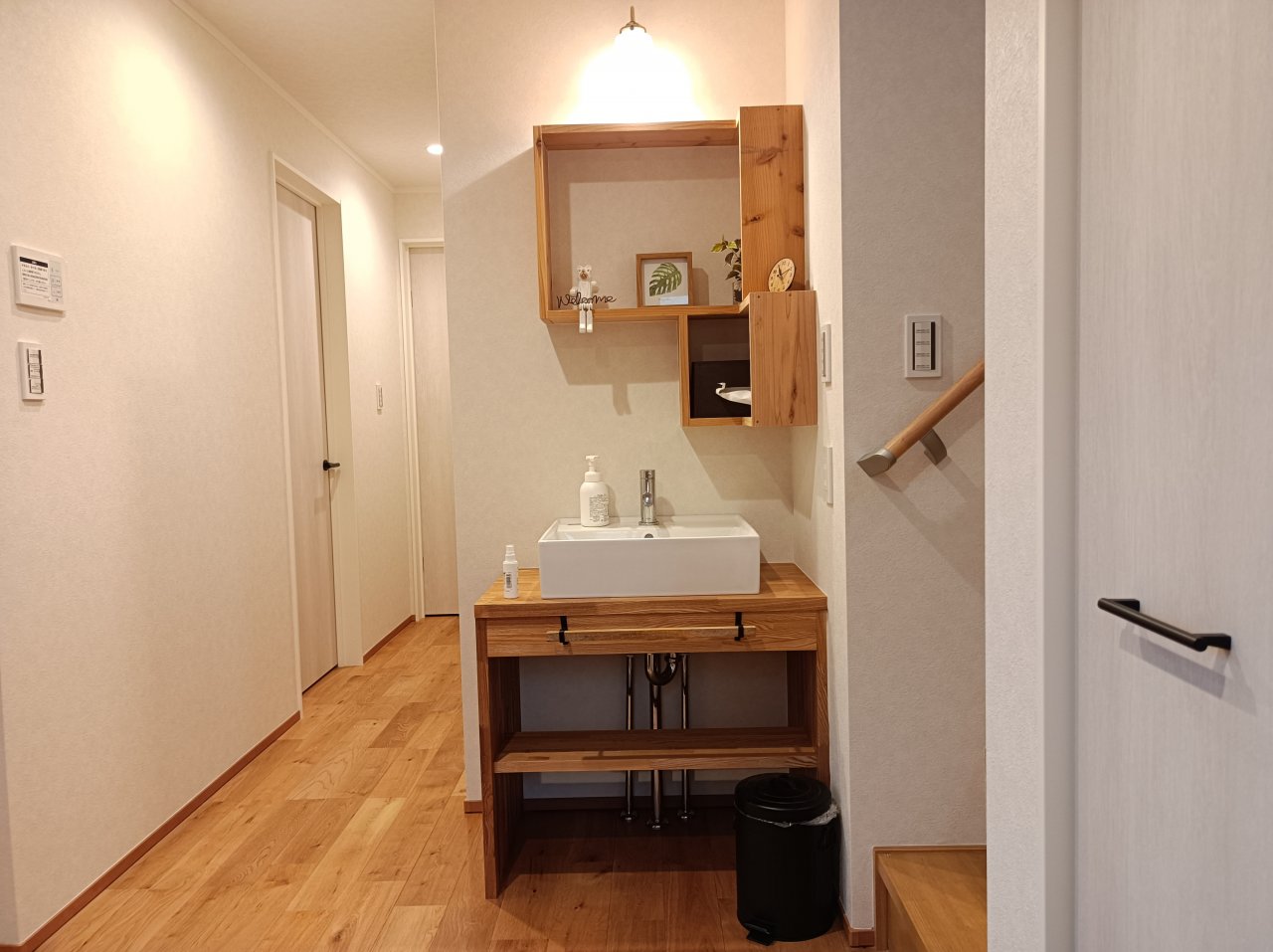 コロナが流行り、手洗いうがいが大切になってきているため、玄関に入ってすぐに洗面台を設けています。