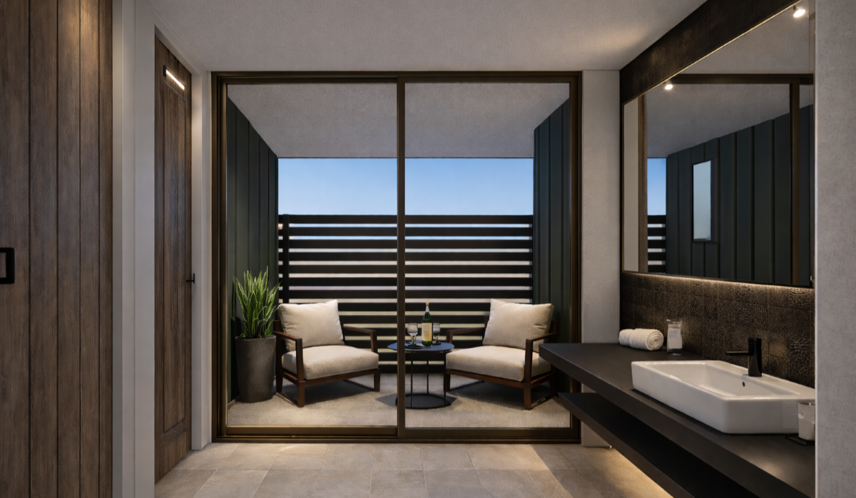 室内とつながるスパエリアは、 家にいながら心と体を整えられる特別な場所。 外部からの視線を抑えつつ、光と空を感じられる設計で、 家族でも安心して使える、上質なプライベート空間です。