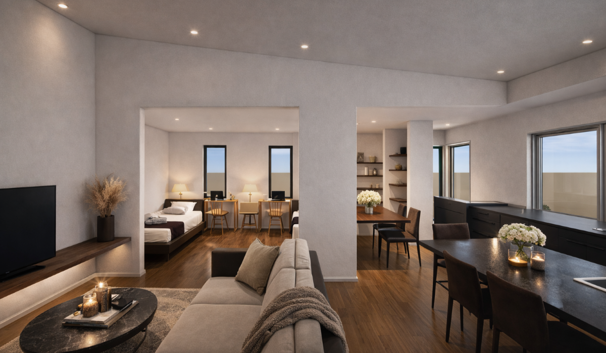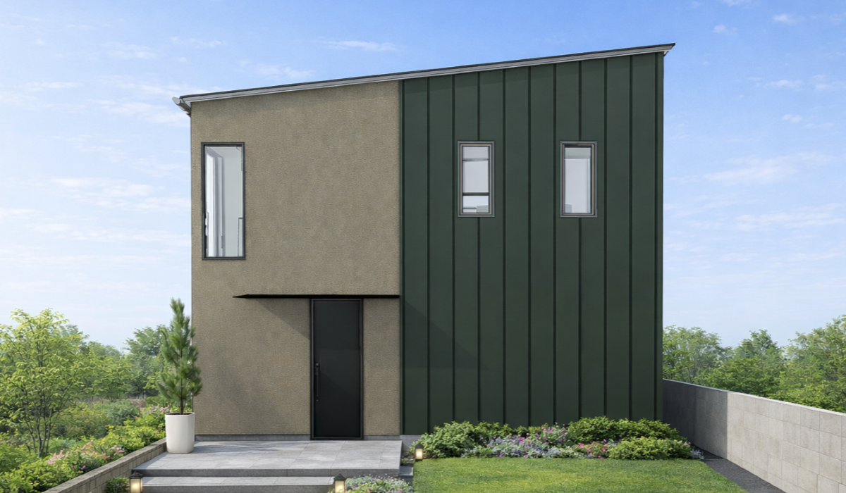 旗竿地の特性を活かし、室内の抜けとアプローチからの印象を丁寧に設計。 ガルバリウムとモルタルを組み合わせた外観が、シャープさと温もりを両立します。