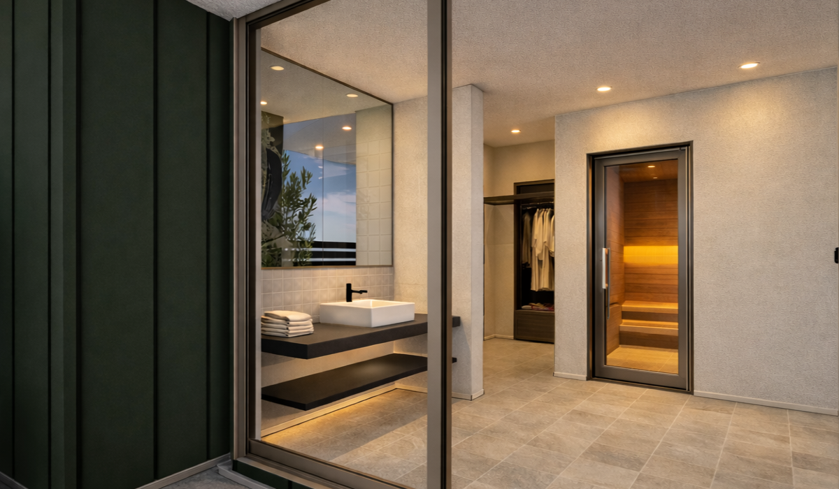 室内とつながるスパエリアは、 家にいながら心と体を整えられる特別な場所。 外部からの視線を抑えつつ、光と空を感じられる設計で、 家族でも安心して使える、上質なプライベート空間です。