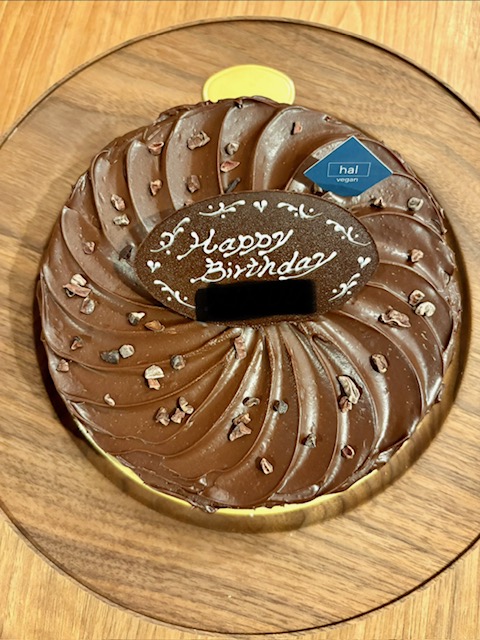 カカオと豆乳クリームを合わせた濃厚なガナッシュを、グルテンフリー&ナッツフリーのチョコレートスポンジでサンドしたチョコレートケーキです。今回は誕生日用にオーダーしました。