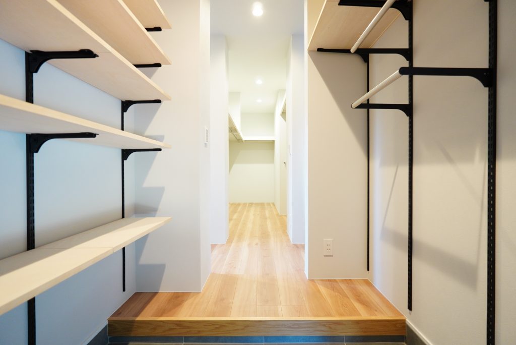 日差しを活かして気持ちよく乾き、急な雨にも安心。 - 脱衣室~WIC~玄関がつながる回遊動線