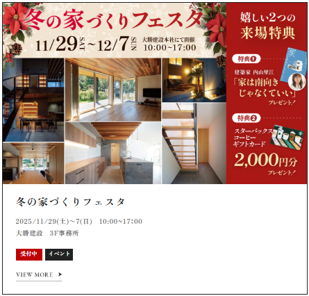 11月29日(土)~12月7日(日)まで冬の家づくりフェスタを絶賛 開催中です。