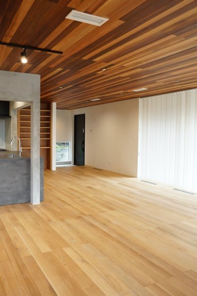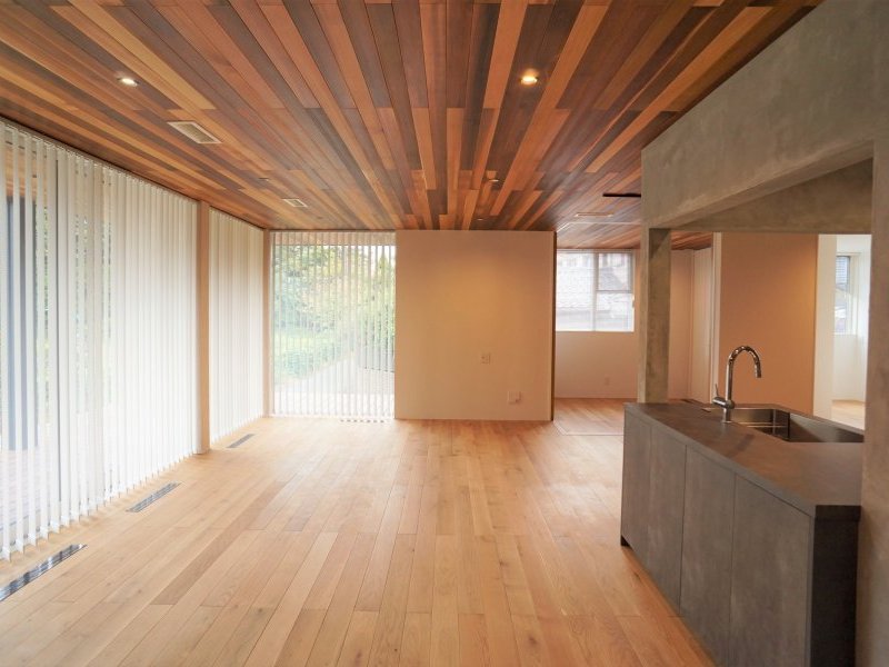 レッドシダーの天井がセンスを感じさせてくれる、大人シックなLDKに仕上げました。広々したリビングは大きなサッシで外のウッドデッキとつながっています。