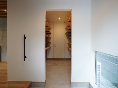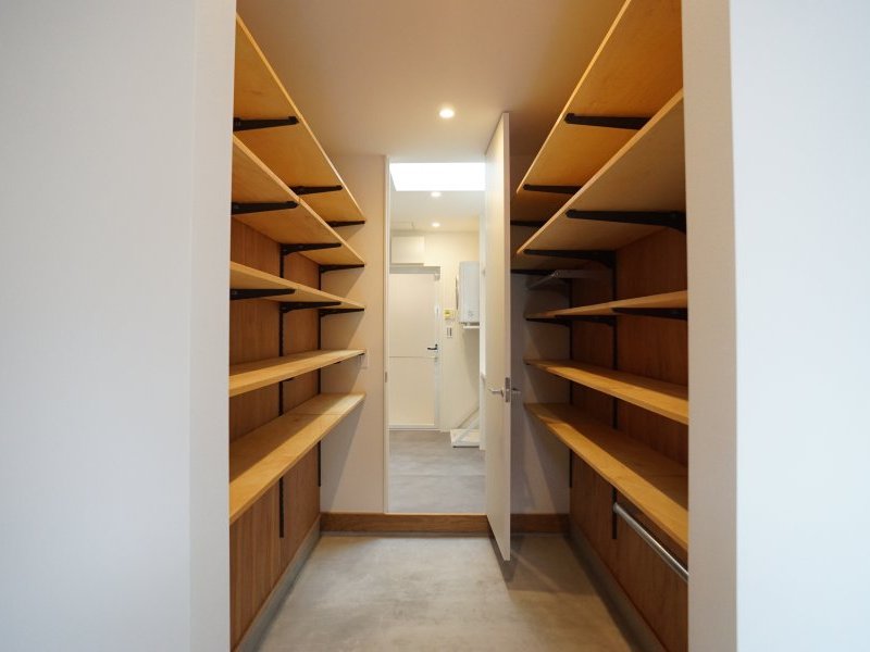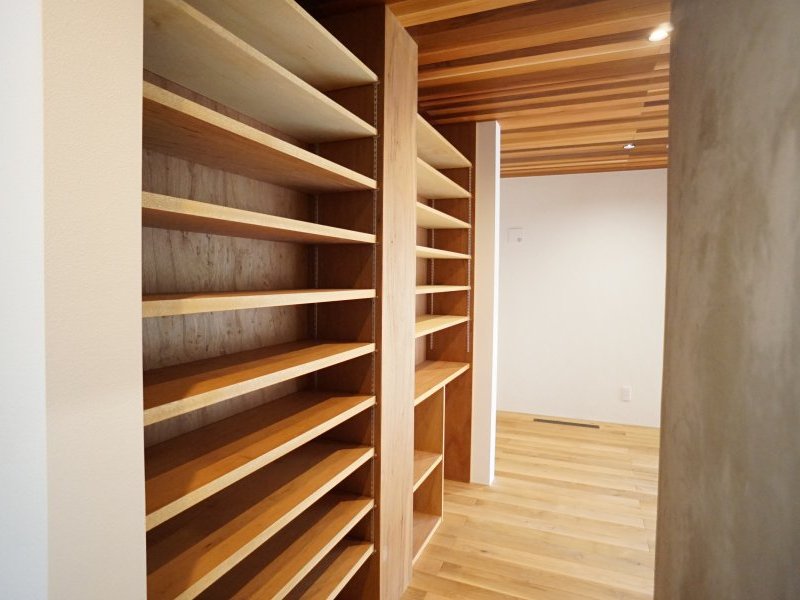 ついついモノが増えてしまいがちな衣類も、季節ごとに分けて・ゆとりをもって収納できるようにウォークインクローゼットを設けました。収納の棚は各場所に十分なサイズ感のものを設け、場所によっては、あえて扉を設けず見せる収納に仕上げています。