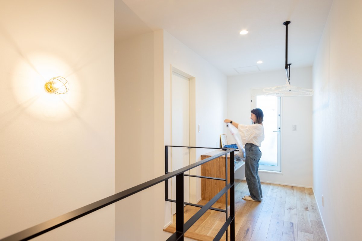 2階には部屋干しスペースを配置。雨の日や花粉が気になる日でもそれらを気にせず洗濯をすることができます。奥様の背丈に合わせた作業・収納棚を設置することで使いやすさがグッとアップ。階段の壁面に設置した照明も良いアクセントになっています。